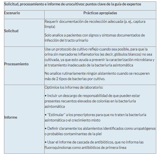 “La guía describe los enfoques para reducir en laboratorio de antibióticos innecesarios so y el diagnóstico erróneo de ITU, y está organizado de acuerdo con el procedimiento para el urocuultivoꟷordenar, procesar y reportar”, apunta el sitio.
