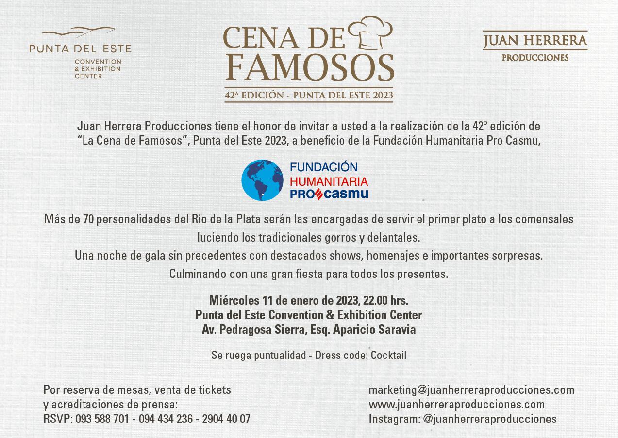 Este miércoles 11 de enero tendrá lugar en Punta del Este una nueva edición de un evento ya tradicional: La Cena de Famosos. En esta oportunidad, se trata de la edición número 42, correspondiente al 2023, y será a beneficio de la Fundación Humanitaria Pro Casmu, una organización que busca ser un catalizador del cambio e inspirar mejoras en la salud, cuidados y la atención, a través del desarrollo de actividades de investigación, asesoría, capacitación y consultoría integral y desarrollo de proyectos y planes en el área de la salud, el bienestar y la vida saludable.